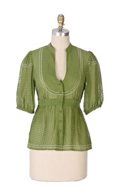 Swiss-dot silk is traced in rivers of silvery squiggles along the yoke, shoulders and hem